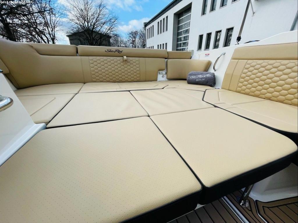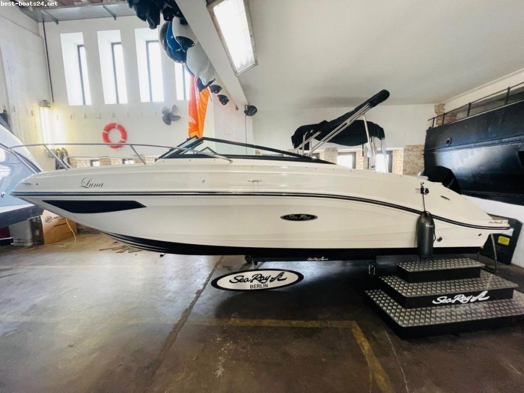 AUSSTATTUNG: ? - digitales Armaturenbrett Simrad Kartenplotter 9 Zoll flächenbündig eingelassen mit Vesselview für Motordaten ? - Navigationskarte ? - Premium Sound System Fusion Fusion MS-NRX300 6 x Fusion 6,5 Zoll Marinelautsprecher mit Subwoofer und Fusion Amplifier 5 Kanal Verstärker mit 1600 Watt ? -"Sea Ray Berlin" Sportlenkrad aus Unserem Flaggschiff der 400 SLX ? - Bimini Top mit Edelstahlgestell mit Verdeckhülle und Sea Ray Logo ? -Voll - bzw. Cabriolpersenning in schwarz mit rausnehmenbaren Front-, Heck und Seitenteilen alle mit Fenster und Tasche ? - Kapitänspaket ? - Komfortpaket ? - Elektrische Ankerwinde, Edelstahlbugrolle mit 10 KG Anker von Lewmar, Edelstahlwirbel und Kette zusätzliche Bug Fernbedienung ? - Blaues LED Ambientelicht auf der Plicht inkl. beleuchteter Edelstahl Getränkehalter ? - Fenderclipse ? - große U Sitzgruppe auf der Plicht umbaubar zur XXl Plichtsonnenliege ? - Wet Bar auf der Plicht Edelstahlspulbecken mit Corian Arbeitsplatte inklkusive Spülenabdeckung ? - manuelle Unterwasserbadeplattform ? - Seadeck im Cockpit in beige mit schwarzer Fuge ? - Seadeck auf der Badeplattform in beige mit schwarzer Fuge ? - Bugsonnenliegepolster auf dem Vorschiff mit Füllkissen für die Dachluke ? - Bugabdeckung für das Sonnenliegepolster ? - Sportpersenning bis über die Frontscheibe ? - Hecksonnenliegepolster anklappbar zum Sitzen ? - Heckdusche mit Edelstahlwassereinlaß ? - XL Teakholztisch Klapptisch mit Edelstahlhaltegriff ? - Wasserskihaken aus Edelstahl ? - abschließbares Handschuhfach ? - Batterieladegerät Onboard ? - großer Kühlschrank im Cockpit Heckstaufach ? - Hecksonnenliege Seitenfüllpolster am Durchgang ? - CE ZERTIFIKAT ? - CE Feuerlöschsystem ? - Decksluke mit Insektenschutz & Rollo ? - Kabine mit V- Koje ? - Kabine mit Fenster Bb und Stb ? - Leselampe in der Kabine ? - Deckenlampe mit separatem Schalter ? - Chemie WC ? - 2 Marine Batterien je 108 AH mit Batteriewahlschalter ? - verstellbarer Fahrersitz und Beifahrersitz mit Flip Up Funktion - für erhöhte Sitzposition ? - 6 x Edelstahlklampen ? - 1 x Bugöse und 2 x Heckösen ? - Edelstahlstoßleiste ? - alle Lukenöffner aus Edelstahl ? - Edelstahl Teleskopbadeleiter 4 stufig unter der Badeplattform ? - Signalhorn ? - Edelstahl Getränkehalter ? - Scheibenwischer Stb ? - Edelstahlbugreling vorn geteilt ?- großer Spiegel in der Kabine ? - Kabinenfenster zum öffnen ? - Wasserskikasten ? - Edelstahl Tankdeckel ? - Staufächer im Motorraum und unter der Sitzgruppe ? - Eisbox ? - trailerbar Länge: 7,15 Meter Schiffsbreite: 2,54 Meter Tiefgang: 0,98 Meter Antrieb oben 0,68 Kraftstofftank: 189 Liter Wassertank: 86 Liter Gern nehmen Wir auch Ihr Boot Inzahlung! www.searay-berlin.de Offizieller Gebietshändler für die renommierte Marke Adlergestell 361 12489 Berlin Öffnungszeiten: Montag bis Freitag: 8.00 - 18.00 Uhr Samstag: 10.00 - 15.00 Uhr Mobil. 0175-1662339