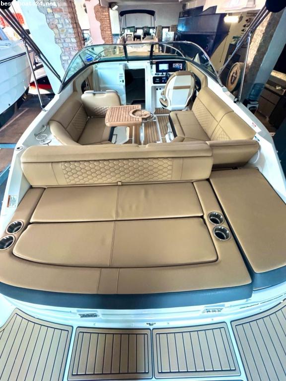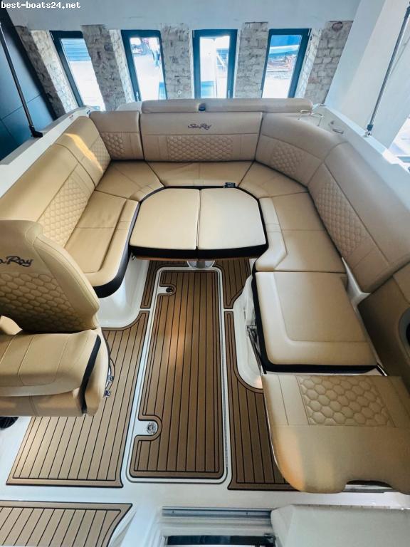 MOTOR: Mercury® MerCruiser® Der V8 neu erfunden Ein 6,2l V8 Motor mit beispiellosem Drehmoment und Beschleunigung um Sie schnell und sanft auf Touren zu bringen. Leistung: PS/kW 350 / 257 Motortyp: V8 Hubraum: 6.2 Liter Antrieb: Bravo III ( Duoprop) mit 2 Edelstahlschrauben ? - Kapitänspaket ? - Dual digitales Armaturenbrett, 2 x 9 Zoll Simrad Touchscreen, Kartenplotter, Tiefenmesser, Wassertemperatur, Tiefenmesser flächenbündig eingelassen mit Vesselview für Motordaten ? - LED Ambietebeleuchtung in blau im Cockpit und alle Edelstahlgetränkehalter ? - Cockpitheizung über den Motor ? - 12 Voltsteckdose und USB Anschluß im Cockpit ? - dynamisch aktive Rumpftrimsystem ? - Sportlenkrad " Sea Ray Berlin " EXKLUSIV EDITION " ? - Bugsonnenpolster auf dem Vorschiff ? - Bugreling für Bugsonnenpolster ? - Docking Lights ? - Unterwasserbeleuchtung in blau ? - Bugstrahlruder von Vetus ? - Sound System Fusion Im Cockpit 4 x Fusion 6,5 Zoll Marinelautsprecher ? - elektrische Ankerwinde, Edelstahlbugrolle mit 10 KG Edelstahlahlanker, Edelstahlwirbel und Kette zusätzliche Bug Fernbedienung ? - Deckswaschanschluss ? - Biminitop auf Edelstahlgestänge und Verdeckhülle ? - Cabrioverdeck alle Seiten-, Front- und Heckteile mit Fenstern in schwarz " Sumbrella" ? - Sportpersenning bis über die Frontscheibe schwarz " Sumbrella" ? - Flaggenstock mit Magnetfuß ? - großer Domtec Kühlschrank im Heckstaufach ? - Batterieladegerät onboard ? - 2 x Batterie Varta je 105AH mit Batteriehauptwahlschalter ? - 12 Volt Steckdosen und Fusion USB Steckdose ? - SeaDek boden auf der kompletten Plicht und im Bugbereich ? - SeaDek auf der Badeplattform ? - manuelle Unterwasser- Badeplattform ? - Scheibenwischer stb ? - Teaktisch mit Edelstahlgriff, Klappbar umbaubar zur großen Sonnenliege auf der Plicht ? - Elektrischem WC mit Fäkalientank ? - Hecksonnenliege ? - verstellbarer Fahrersitz mit Flipup Funktion ? - LED Plichtbeleuchtung auf dem gesamten Cockpit ? - Edelstahl Getränkehalter ? - Heckdusche ? - Signalhorn ? - LED Navigationsbeleuchtung und Ankerlicht ? - Bilgenpumpe und Bilgenlüfter ? - Fenderclips ? - Grauwassertank mit Edelstahlabsaugstutzen ? - Frischwassertank 76 Liter ? - Edelstahl ? - Wasserskihaken ? - 4 stufige Edelstahlbadeleiter ? - 6 x Edelstahlbelegklampen ? - Schweizer Spezifikation Öl - Motorwanne Wassertank: 76 Liter Gern nehmen Wir auch Ihr Boot Inzahlung! www.searay-berlin.de Offizieller Gebietshändler für die renommierte Marke Geschäftsführer: Herr Stefan Seckler Mobil. 0175-1662339