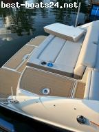 Rumpf weiß grauer Gelcoatstreifen Polster Stormgrey Kapitänspaket (Sportpersenning, Heckdusche, Fenderclipse...) Cockpit Persenning Digitales Cockpit Bimini Verdeck Paket Camper Verdeck Paket Kühlschrank 12Volt unter Sitzbank Großer Teaktisch mit Füllpolster Hohe Bugrelung Elt Ankerwinde mit Edelstahlanker Bugstrahlruder Klappbare Unterwasserplattform im Heck Ölwanne unter Motor Antifouling schwarz Onboard Batterie-Ladegerät Victron Landanschlußstecker Chrom mit Sicherungskasten und 220V Steckdose im Cockpit bei Landstromversorgung und FI-Schalter Seadek Sonderfarbe Dune/stormgrey im Cockpit Badeplattform und Treppe zum Vorschiff und Sonderumfängen im Durchgang und klappbarer Badeplattform